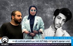 خبرگزاری هرانا – زینب موسوی، کمدین ایرانی خالق شخصیت «امپراطور کوزکو» با تودیع قرار وثیقه آزاد شد. همچنین، سینا ملکشاه‌ میران دانشجوی دانشگاه هرمزگان و علی منصوری دانشجوی دانشگاه علم و صنعت، توسط نیروهای امنیتی بازداشت شدند.