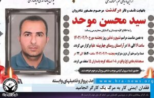در این گزارش بدون اشاره به علت مرگ این کارگر آمده است، سید محسن موحد، کارگر شاغل در شرکت پیمانکاری تابان انرژی پاسارگاد در پتروشیمی گچساران، جان خود را از دست داده است.