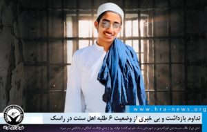 خبرگزاری هرانا – سعید سپاهی و هادی نارویی، نوجوان، عبدالاحد دهانی، رفیع الله، زاهد و محب الله (نام خانوادگی نامشخص)، شش طلبه اهل سنت مدرسه دینی انوارالحرمین در شهرستان راسک علیرغم گذشت دوازده روز از زمان بازداشت، کماکان در بازداشت و بیخبری بسر میبرند.