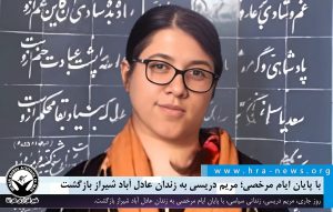 به گزارش خبرگزاری هرانا، ارگان خبری مجموعه فعالان حقوق بشر در ایران، مریم دریسی به زندان عادل آباد شیراز بازگشت.