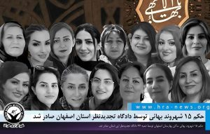 به گزارش خبرگزاری هرانا، ارگان خبری مجموعه فعالان حقوق بشر در ایران، حکم ۱۵ شهروند بهائی ساکن بهارستان اصفهان توسط دادگاه تجدیدنظر این استان صادر شد.
