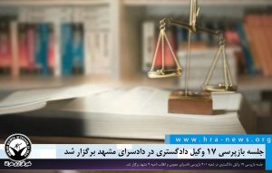 خبرگزاری هرانا – جلسه بازپرسی الهام آراسته، امیردخت بهاره بذرگر، امین شهلا، سحر دشتی داغیانی، سعید جوادی، سیدجعفر ساغروانیان، سید روح الله حسینی، سید عنایت اله کراماتی، سیده فائزه سیدی، سیده وجیهه قرشی یزدی، علی اصغر دشتی، فرزانه صفری، کاظم چزگی، محسن رستمی، محمدرضا یزدانی، مهدی محمد حسینیان و میترا ایزدی فر وکلای دادگستری استان خراسان در شعبه ۹۰۱ بازپرسی دادسرای عمومی و انقلاب ناحیه ۹ مشهد برگزار شد.