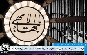 خبرگزاری هرانا – امروز چهارشنبه ۳ بهمن ماه، ۱۰ زن بهائی به نام های نسرین خادمی قهقرخی، رویا آزادخوش سارا شکیب، بشری مطهر، مژگان پورشفیع اردستانی، مریم خرسندی، شورانگیز بهامین، ساناز راسته، فیروزه راستی نژاد و آزیتا رضوانی خواه جهت اجرای حکم حبس بازداشت و به زندان دولت آباد اصفهان منتقل شدند.