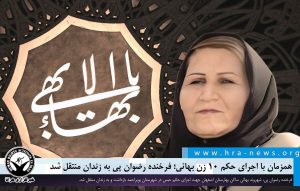 خبرگزاری هرانا – امروز فرخنده رضوان پی، شهروند بهائی ساکن بهارستان اصفهان جهت اجرای حکم حبس در شهرستان بویراحمد بازداشت و به زندان منتقل شد. لازم به ذکر است، روز جاری ، ۱۰ زن دیگر بهائی به نام های نسرین خادمی قهقرخی، رویا آزادخوش سارا شکیب، بشری مطهر، مژگان پورشفیع اردستانی، مریم خرسندی، شورانگیز بهامین، ساناز راسته، فیروزه راستی نژاد و آزیتا رضوانی خواه نیز جهت اجرای حکم حبس بازداشت و به زندان دولت آباد اصفهان منتقل شده اند.