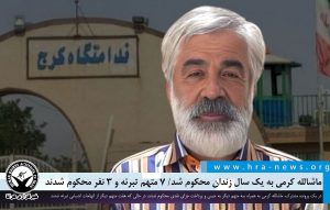 خبرگزاری هرانا – ماشالله کرمی، پدر محمدمهدی کرمی، معترض اعدامشده، توسط شعبه ۱۲ دادگاه تجدیدنظر استان البرز به یک سال حبس محکوم شد. وی پیشتر در خصوص این بخش از پرونده خود توسط شعبه ۱۰۲ دادگاه کیفری دو شهرستان نظرآباد به هشت سال و ۱۰ ماه حبس، یک میلیارد و ۹۰۰ میلیون تومان جریمه نقدی محکوم شده بود. همچنین، هفت متهم دیگر در این پرونده تبرئه شده و دو متهم هریک به پرداخت ۵۰ میلیون تومان جزای نقدی محکوم شدند. حکم حبس یک متهم دیگر نیز عینا تایید شد. این ۱۰ نفر پیشتر هر یک به ۹۱ روز حبس محکوم شده بودند.