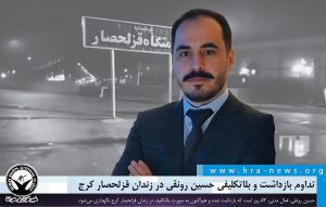 خبرگزاری هرانا – حسین رونقی، فعال مدنی که در تاریخ ۳ تیرماه بازداشت شده است، با گذشت ۵۳ روز از زمان دستگیری، همچنان به صورت بلاتکلیف در زندان قزلحصار کرج نگهداری میشود.