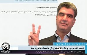 خبرگزاری هرانا – خسرو علیکردی، وکیل دادگستری، از محرومیت خود از تحصیل در مقطع دکتری حقوق دانشگاه تهران خبر داد.