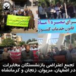 تجمعات امروز این بازنشستگان در شهرهای ارومیه، کرمانشاه، مریوان، اصفهان، همدان، شیراز، بیجار، زنجان، تبریز، سنندج، تهران و اهواز برگزار شده است.