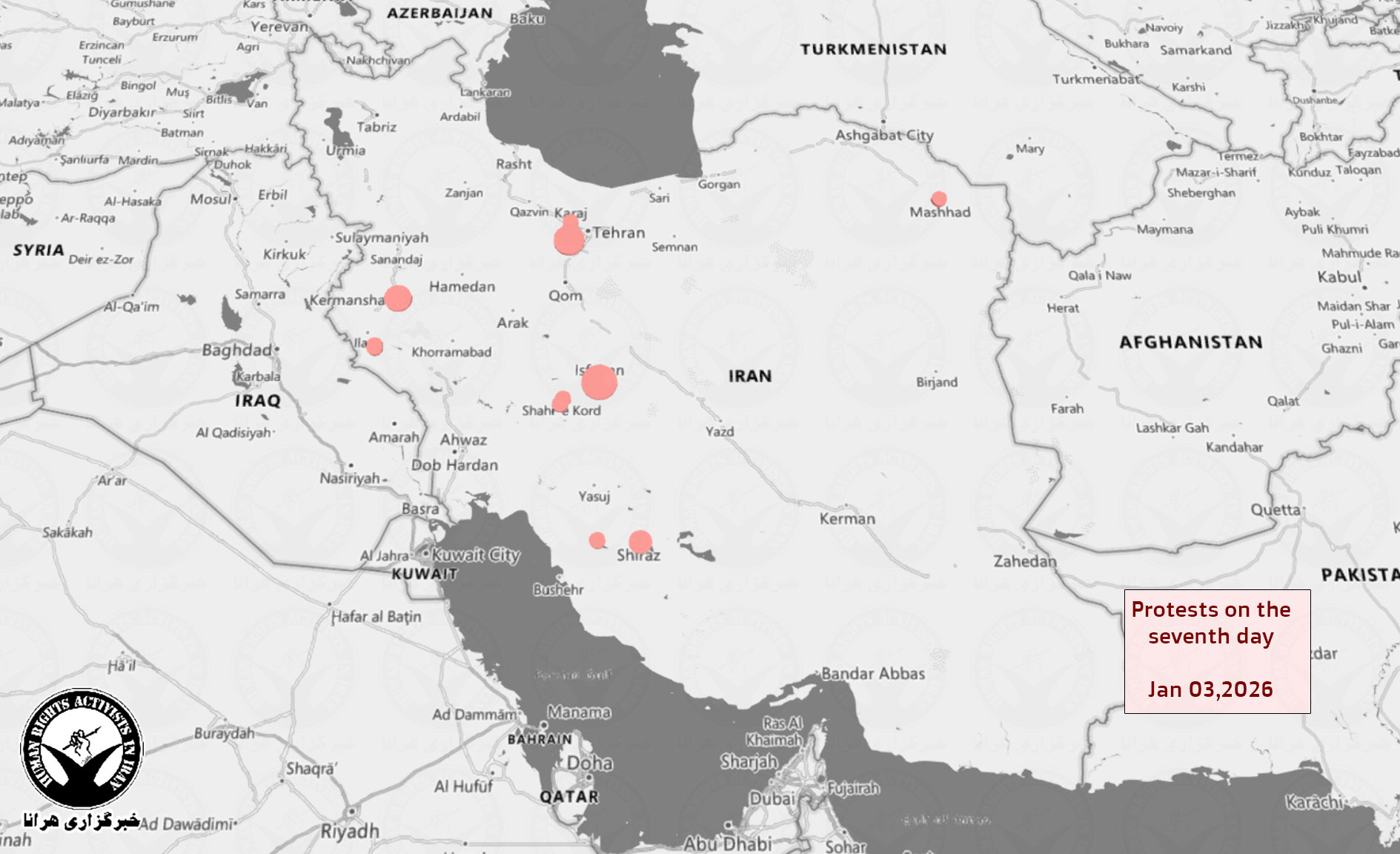 با توجه به گزارشات راستی آزمایی شده تا زمان انتشار این گزارش، مجموعا ۱۷۴ اعتراض در هفت روز اخیر در ۶۰ شهر از ۲۵ استان گزارش شده است. ۱۸ تجمع دانشجویی در ۱۵ دانشگاه نیز جزوی از این آمار است.