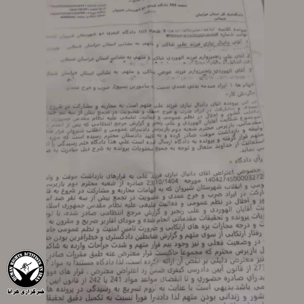 خبرگزاری هرانا – شعبه ۱۰۳ دادگاه کیفری دو شهرستان شیروان، اعتراض دانیال نیازی، معترض ۱۸ ساله، به قرار بازداشت موقت را رد و بازداشت او را در پروندهای با اتهاماتی از جمله محاربه تایید کرد؛ اتهامی که در صورت اثبات میتواند به مجازاتهای سنگینی از جمله اعدام منجر شود.
