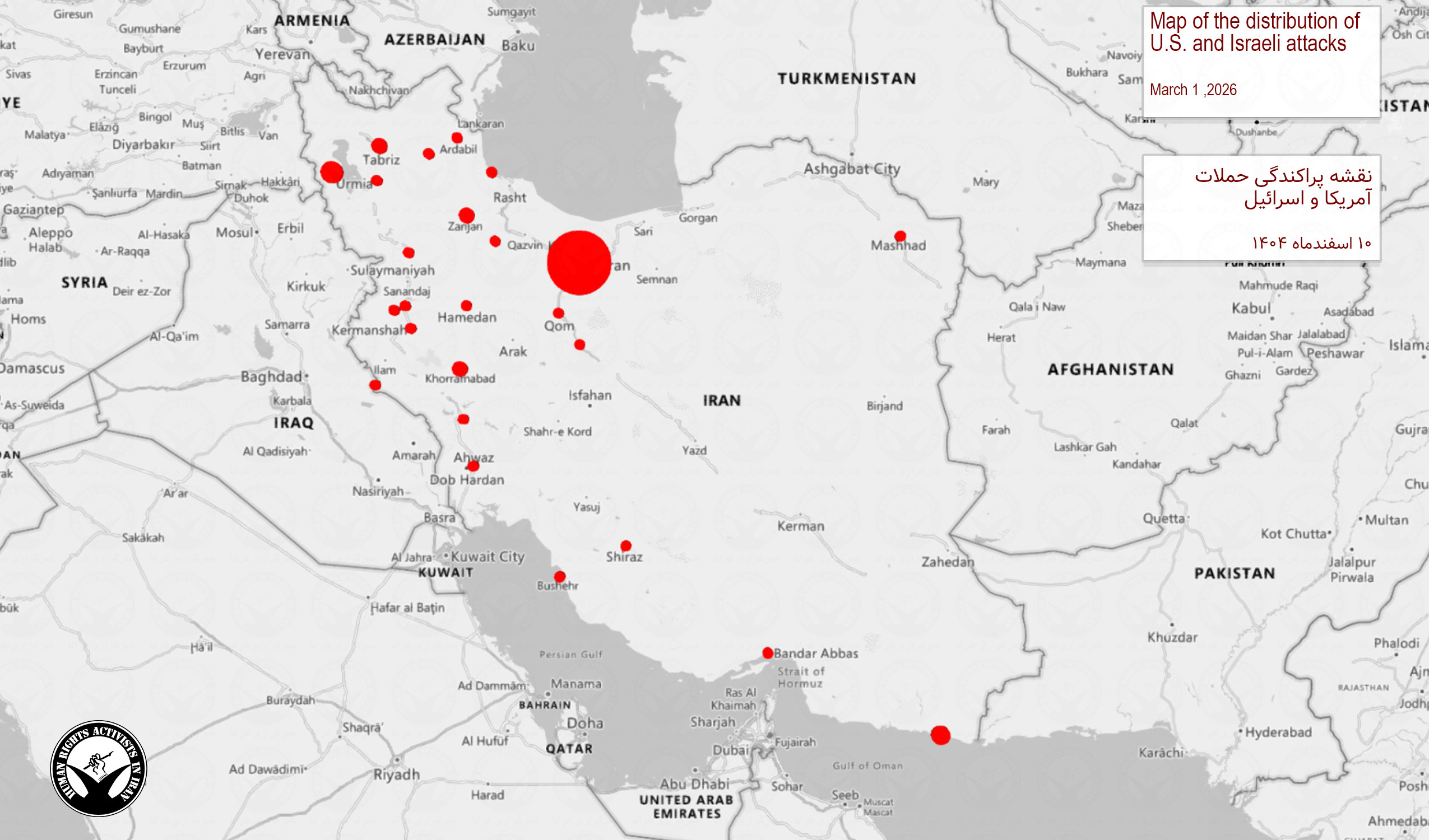 به گزارش خبرگزاری هرانا، ارگان خبری مجموعه فعالان حقوق بشر در ایران، در ۲۴ ساعت منتهی به ۱۰ اسفند ۱۴۰۴، بحران ناشی از حمله آمریکا-اسرائیل به ایران، وارد مرحله‌ای شد که همزمان چند خط تحولی را در کنار هم پیش می‌برد، از یک سو، دامنه حملات در سطح کشور گسترش یافت و طبق داده‌های روزانه، دست‌کم ۷۲ رخداد در ۲۰ استان ثبت شد و وزن جغرافیایی حملات به شکل چشمگیری به تهران منتقل شد. از سوی دیگر، تحولات سیاسی و انسانیِ همزمان—از تأیید مرگ آیت‌الله علی خامنه‌ای تا انتشار گزارش‌های متناقض درباره سرنوشت محمود احمدی‌نژاد—فضای عمومی را وارد فاز تازه‌ای از عدم‌قطعیت و التهاب کرد.