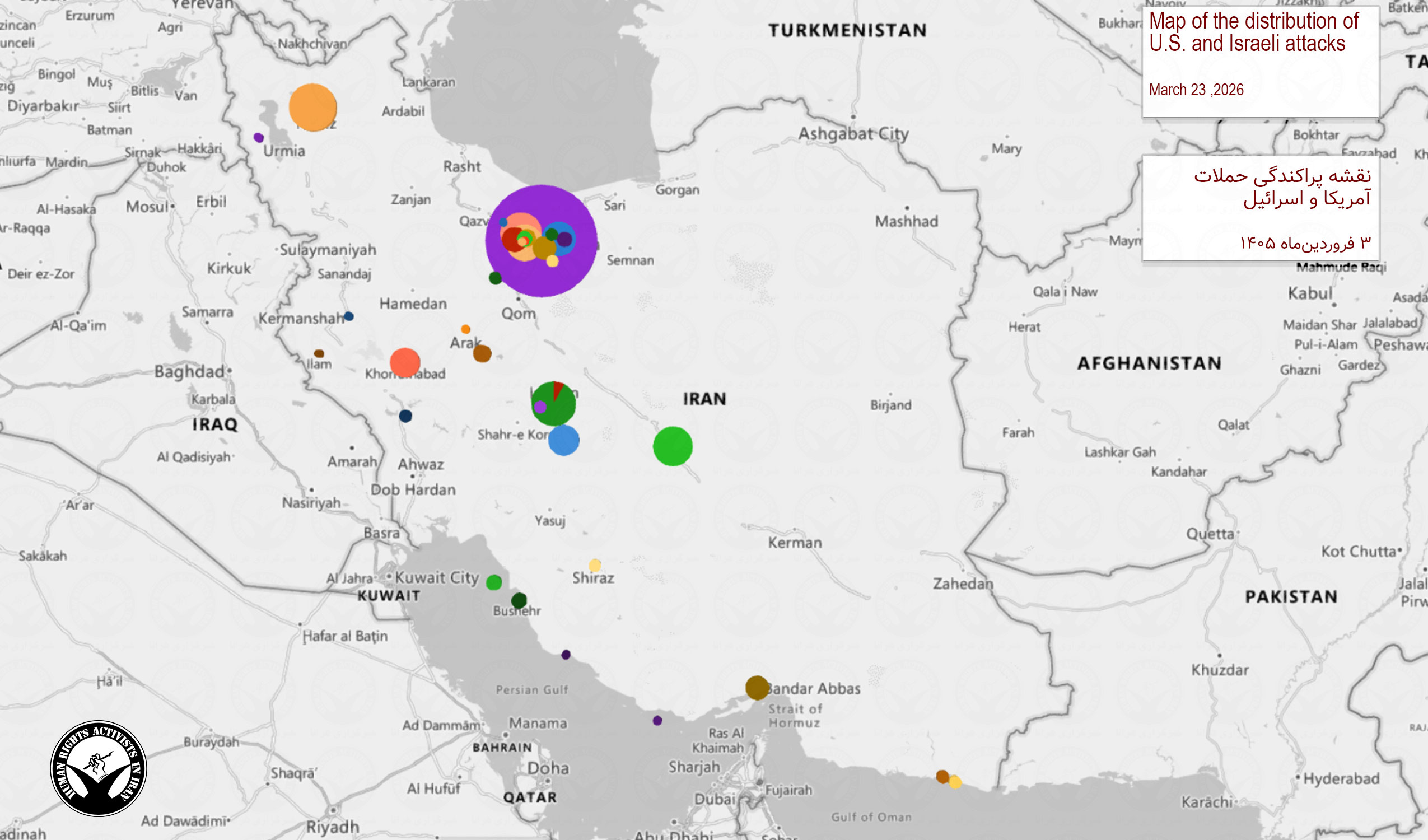 بر اساس اطلاعات ثبت و راستی‌آزمایی‌شده توسط خبرگزاری هرانا، از نخستین دقایق تا پایان روز ۳ فروردین ۱۴۰۵، دست‌کم ۳۶ غیرنظامی کشته و ۱۳۸ غیرنظامی زخمی شده‌اند.