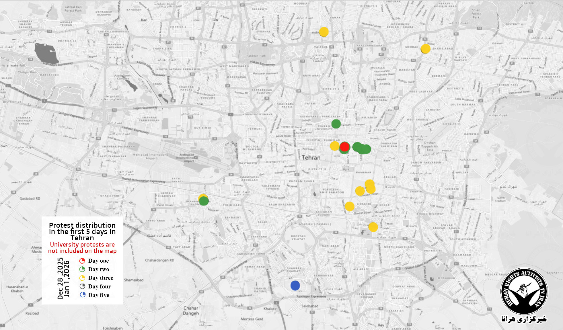 اطلاعات گردآوریشده توسط هرانا، نشان میدهد که در پنجمین روز اعتراضات، تجمعات اعتراضی و اعتصابات صنفی در شهرها و نقاط زیر گزارش شده است: