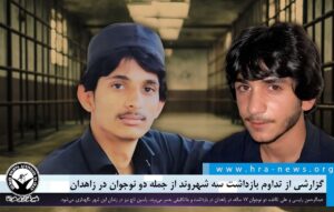 خبرگزاری هرانا – عبدالرحمان رئیسی و علی تلاتف، دو نوجوان ۱۷ ساله، اواسط فروردین ماه در چابهار بازداشت شده و مدتی بعد به یکی از بازداشتگاه های امنیتی در زاهدان منتقل شده‌اند. همچنین، یاسین تاج، اوایل فروردین ماه در شهرستان سرباز بازداشت شده و چندی بعد به زندان زاهدان منتقل شده است.