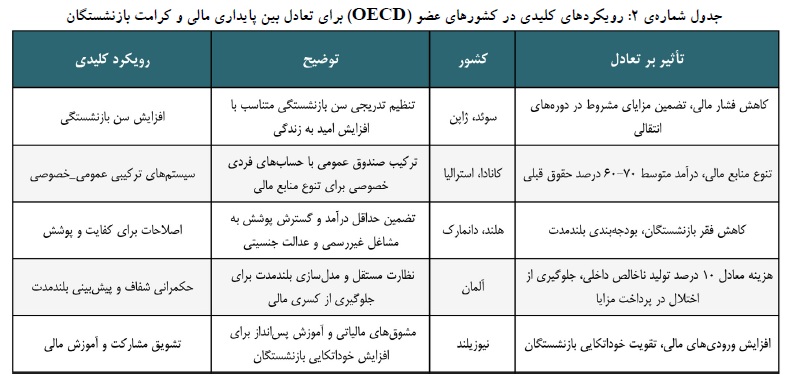 کشورهای عضو «سازمان همکاری و توسعه‌ی اقتصادی» (OECD) با اتخاذ رویکردهای ساختاری و بلندمدت، تعادل بین پایداری مالی و کفایت مزایا را برقرار کرده‌اند. جدول زیر راهکارهای کلیدی این کشورها را نشان می‌دهد:
