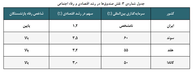 صندوق‌های بازنشستگی از طریق سرمایه‌گذاری در بازارهای مالی و پروژه‌های زیرساختی، به رشد اقتصادی و افزایش رفاه اجتماعی کمک می‌کنند. جدول زیر مقایسه‌ای بین ایران و کشورهای پیشرفته ارائه می‌دهد: