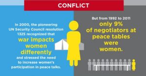۲- علی رغم تلاش های بین الملی از جانب نهادها و تشکل های مدنی زنان و مذاکرات سالانه در سازمان ملل، تنها ۲ درصد از زنان در خلال سال های ۲۰۱۷-۱۹۹۰ بر سر میز مذاکرات صلح، فرصت حضور داشته اند.