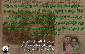 حال که مى بایست این مهم رخ مى داد و نداد از شما سفرای محترم و می خواهیم در خوش نمایی ها از وضعیت زندان و زندانیان آن شریک نشوید و به صورت کاملاً سرزده به اوین و قرچک و فشافویه و رجایی شهر و سایر زندان های تهران و شهرستان های ایران بروید تا از آن تصویری حقیقی به دست آورید. ما تعداد بیشماری از زندانیان سیاسی در زندان هستیم چون خواستیم تصویری حقیقی از وضعیت نا بسامان حقوق بشر در جمهوری اسلامی ایران ارائه دهیم در این راه متحمل هزینه های سنگین شده ایم و خانواده هایمان نیز به طرق مختلف مورد آزار و اذیت قرار گرفتند و حتی ما را از شما پنهان مى کنند . ما که خواستیم حداقل بهبودی در شرایط زندان ها و برای زندانیان حاصل شود حال در زندانیم و شما سفرای گرامی به واسطه برنامه ای هدفمند و از پیش تعیین شده خواسته ما را به تعویق انداختید چرا که از شما و حضورتان در این بزرگترین زندان ایران یعنی اوین استفاده ابزاری شد تا در روزنامه هایشان تیتر بزنند: “برخی کشورها و رسانه ها تصویری دروغین و نا صحیح از زندان های ایران نشان مى دهند” از شما دعوت کردند تا از شما استفاده کنند و بتوانند با نمایش و فریب گزارشهای نهادهای حقوق بشری و بین المللی از زندانهای ایران را بی پایه و اساس نام نهند. حال آنکه شما مى توانستید و میتوانید با تصویری حقیقی و نه نمایشی و نمادین از زندانهای جمهوری اسلامی ایران ، بهبودی در شرایط آن حاصل فرمایید.