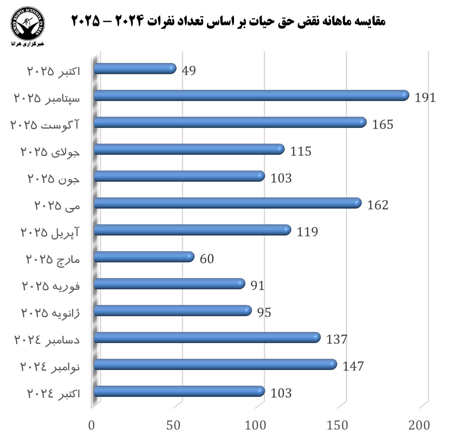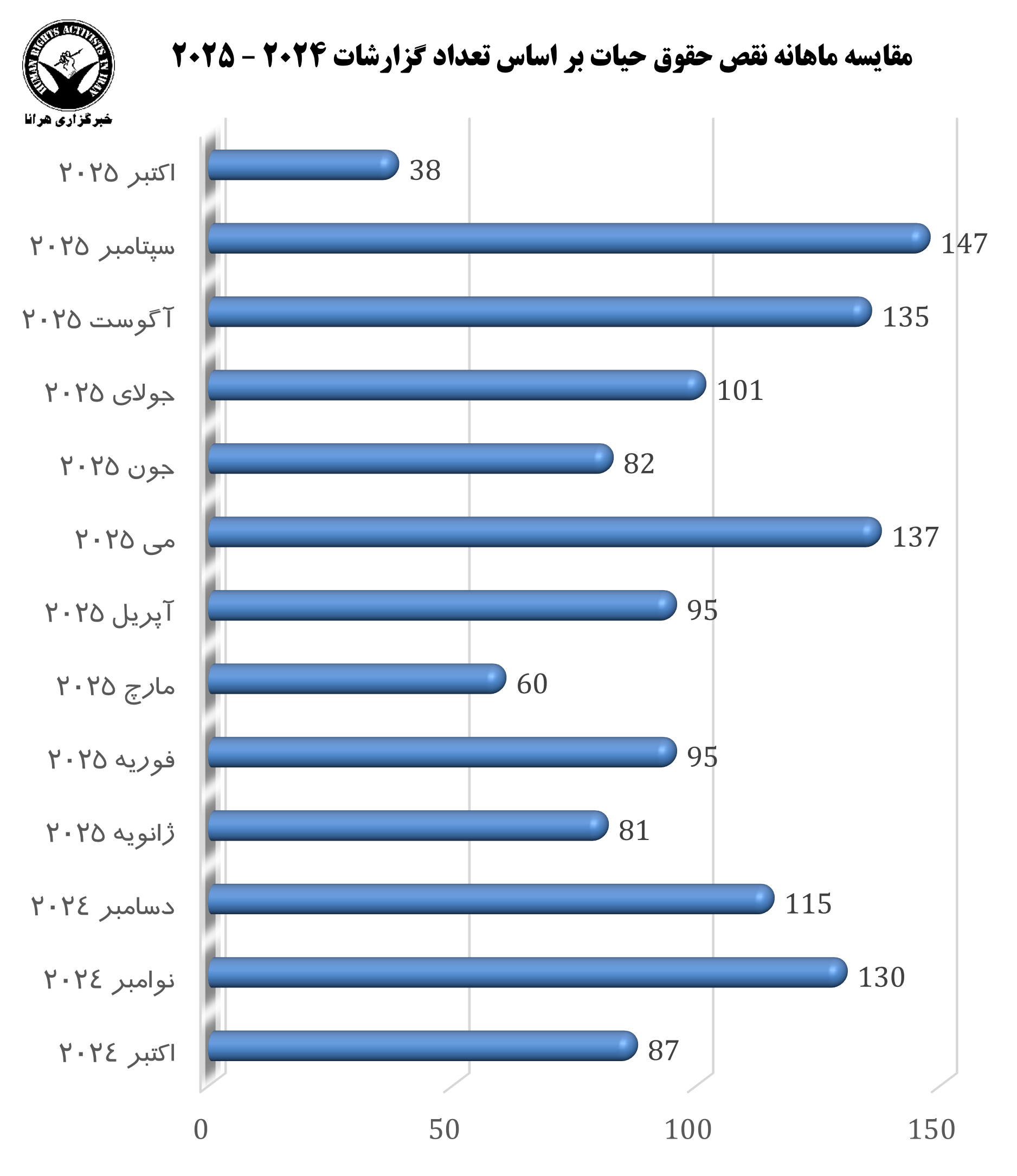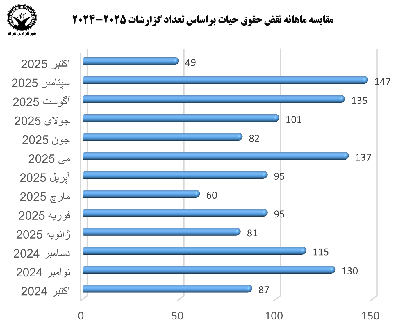 همانطور که در نمودار ذیل مشاهده می شود بر اساس تعداد نفرات اعدام شده، بیشترین تعداد گزارشات در سپتامبر ۲۰۲۵ منتشر شده است و بیشترین نزول تعداد گزارشات نیز در ماه اکتبر ۲۰۲۵ دیده میشود. هر چند تنها یک سوم ماه اکتبر ۲۰۲۵ سپری شده است و احتمال تغییر آمارها در پایان ماه می رود.