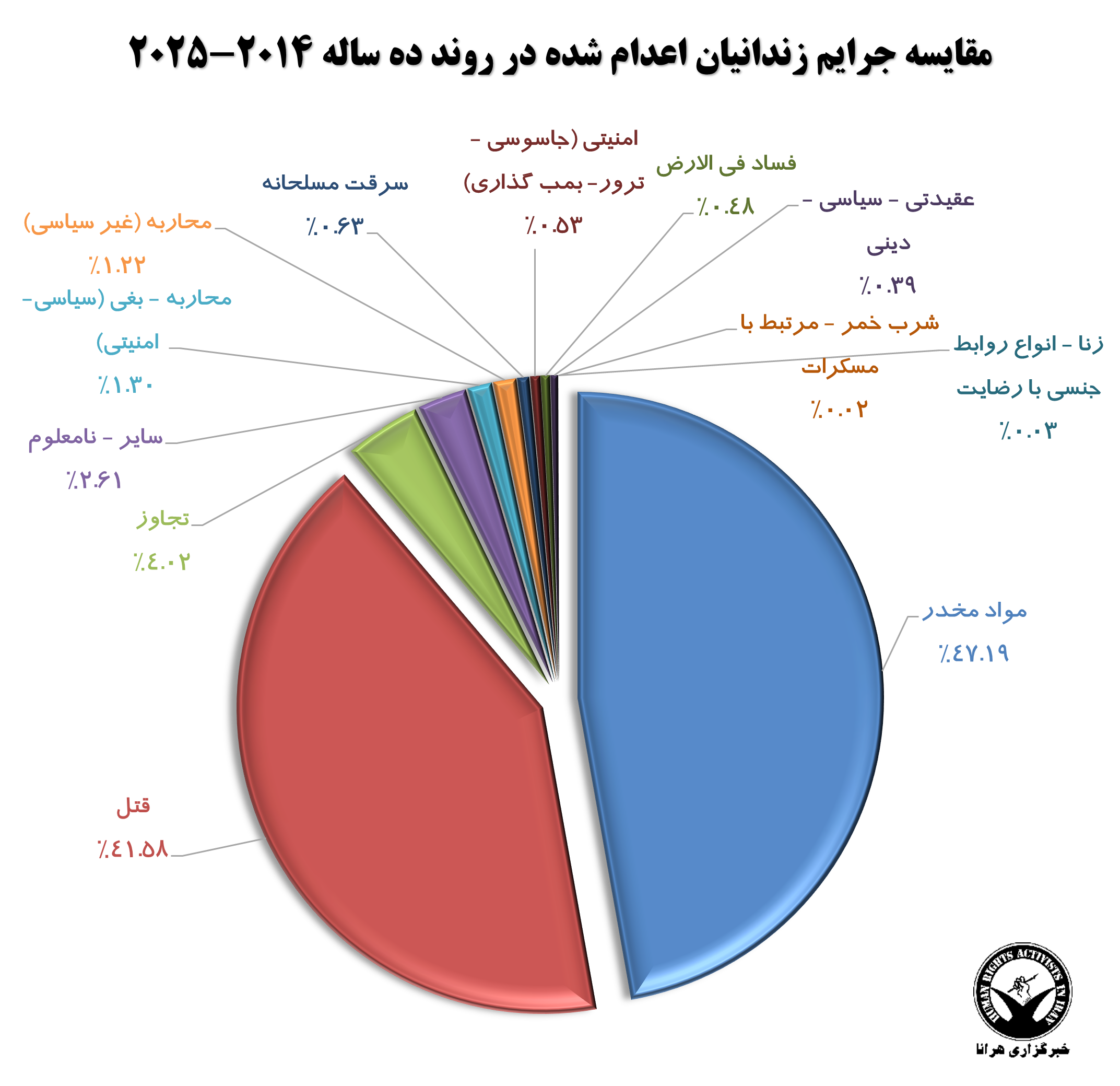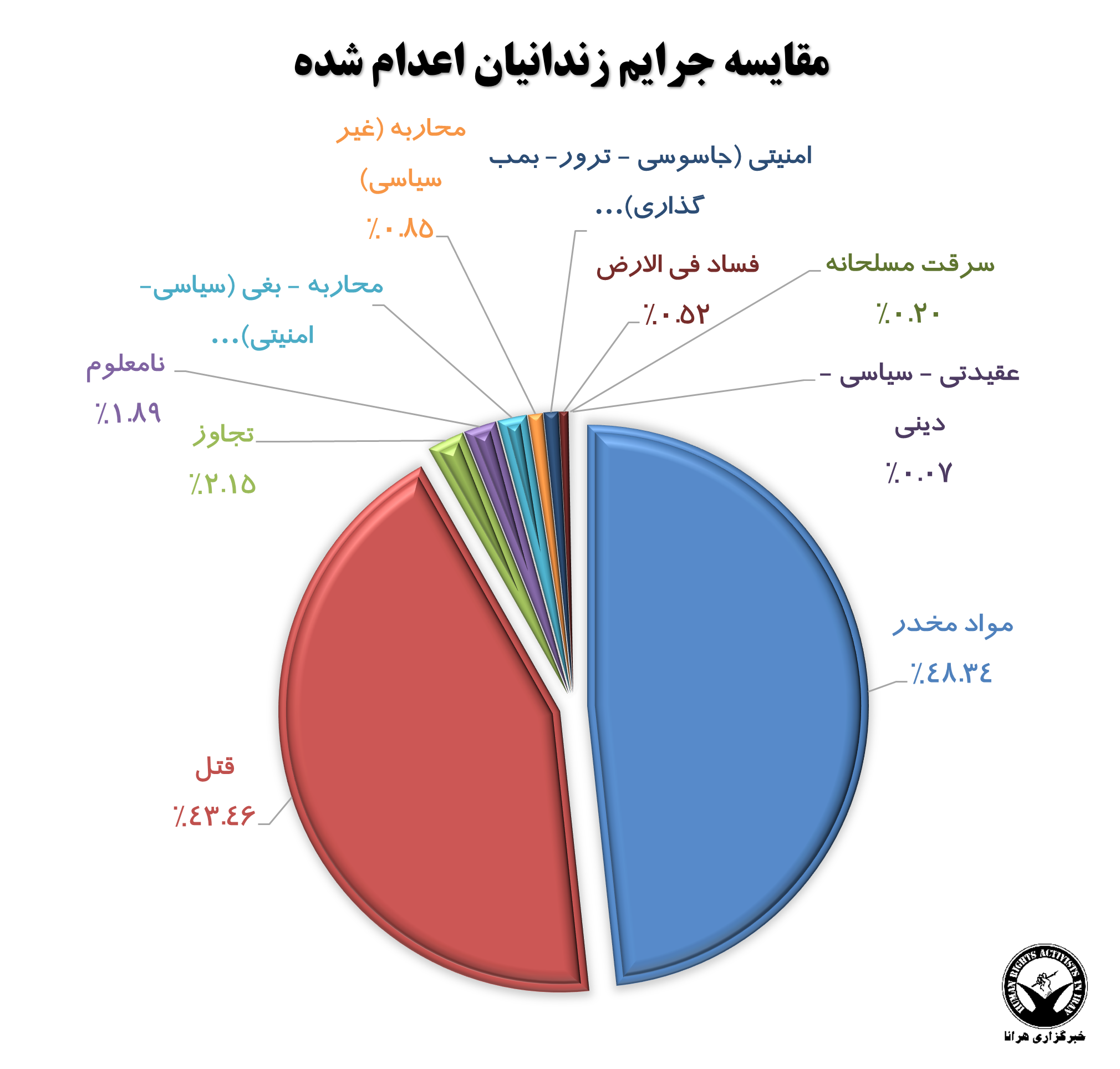 بر اساس اطلاعات گردآوری شده، ۴۸.۳۴٪ اعدام شدگان به اتهام جرایم مربوط مواد مخدر و ۴۳.۴۶٪ به اتهام قتل در ایران اعدام شدند. همچنین ۲.۱۵٪ به اتهام تجاوز، ۱.۸۹٪ با اتهامات نامعلوم، ۱.۶۹٪ با اتهام محاربه – بغی (سیاسی – امنیتی)، ۰.۸۵% به اتهام محاربه (غیر سیاسی)، ۰.۸۵٪ با اتهام امنیتی (جاسوسی – ترور- بمب گذاری)، ۰.۵۲% اتهام فساد فی الارض، ۰.۲٪ به اتهام سرقت مسلحانه و ۰.۰۷% با اتهام عقیدتی – سیاسی – دینی را در بر میگیرد.