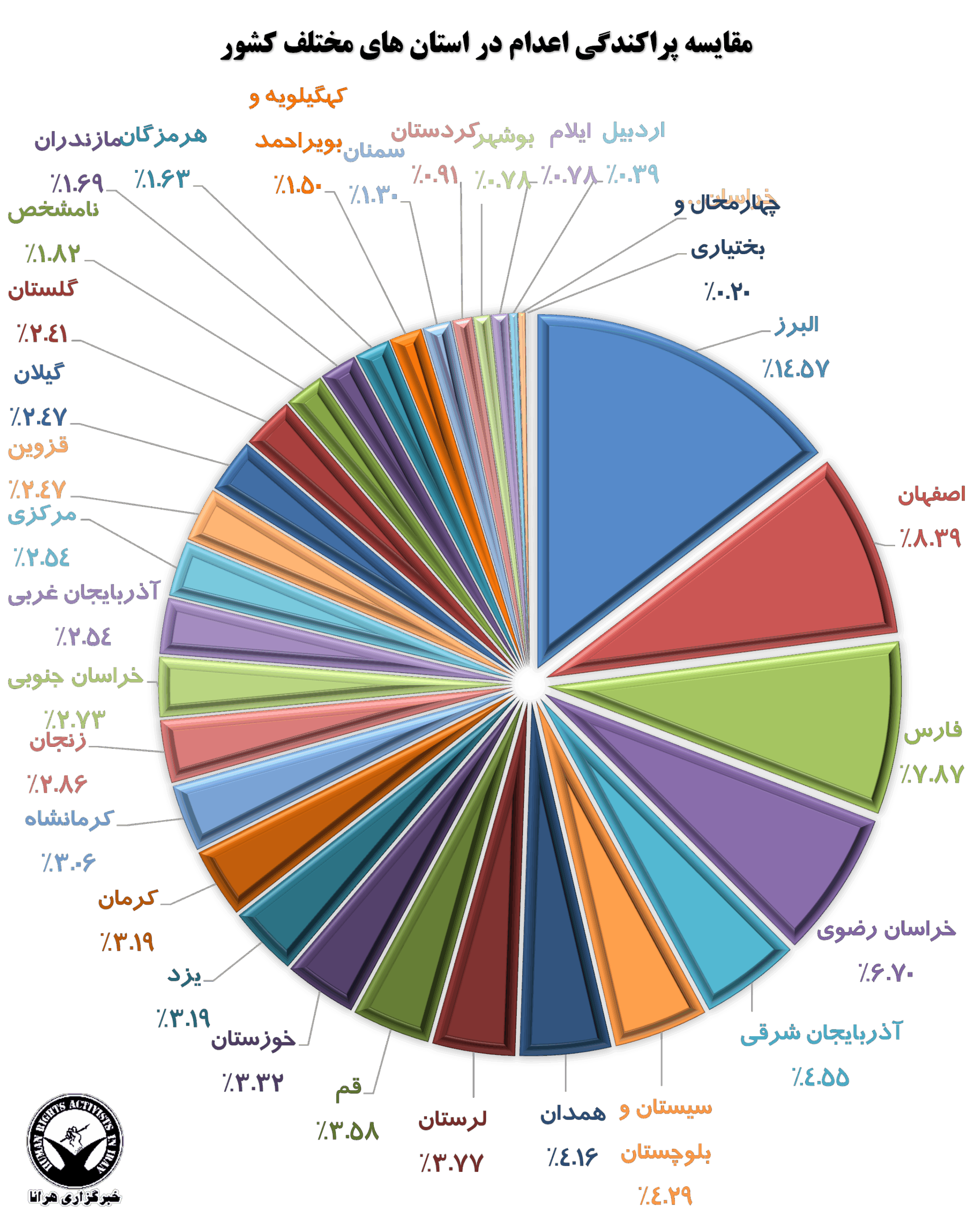 در نمودار دایره ای زیر اجرای حکم اعدام در استان های مختلف کشور مورد بررسی قرار گرفته است که بر این اساس استان البرز با سه زندان پرجمعیت و مهم کشور با ۱۴.۵۷٪ در صدر، استان اصفهان ۸.۳۹٪ و استان فارس با ۷.۸۷٪ در رده دوم و سوم قرار دارند.