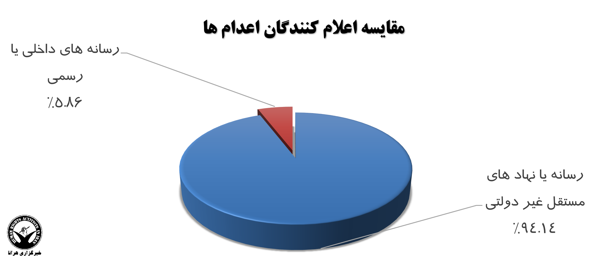 در این نمودار که رابطه مستقیمی با اعدام مخفیانه زندانیان دارد، اعدام هایی که از سوی منابع مستقل و حقوق بشری گزارش شده است مورد بررسی قرار گرفته است که بر اساس نمودار زیر ۹۴.۱۴٪ اعدام شدگان به صورت مخفیانه یا بدون اعلام در رسانه های جمعی اعدام شده اند.