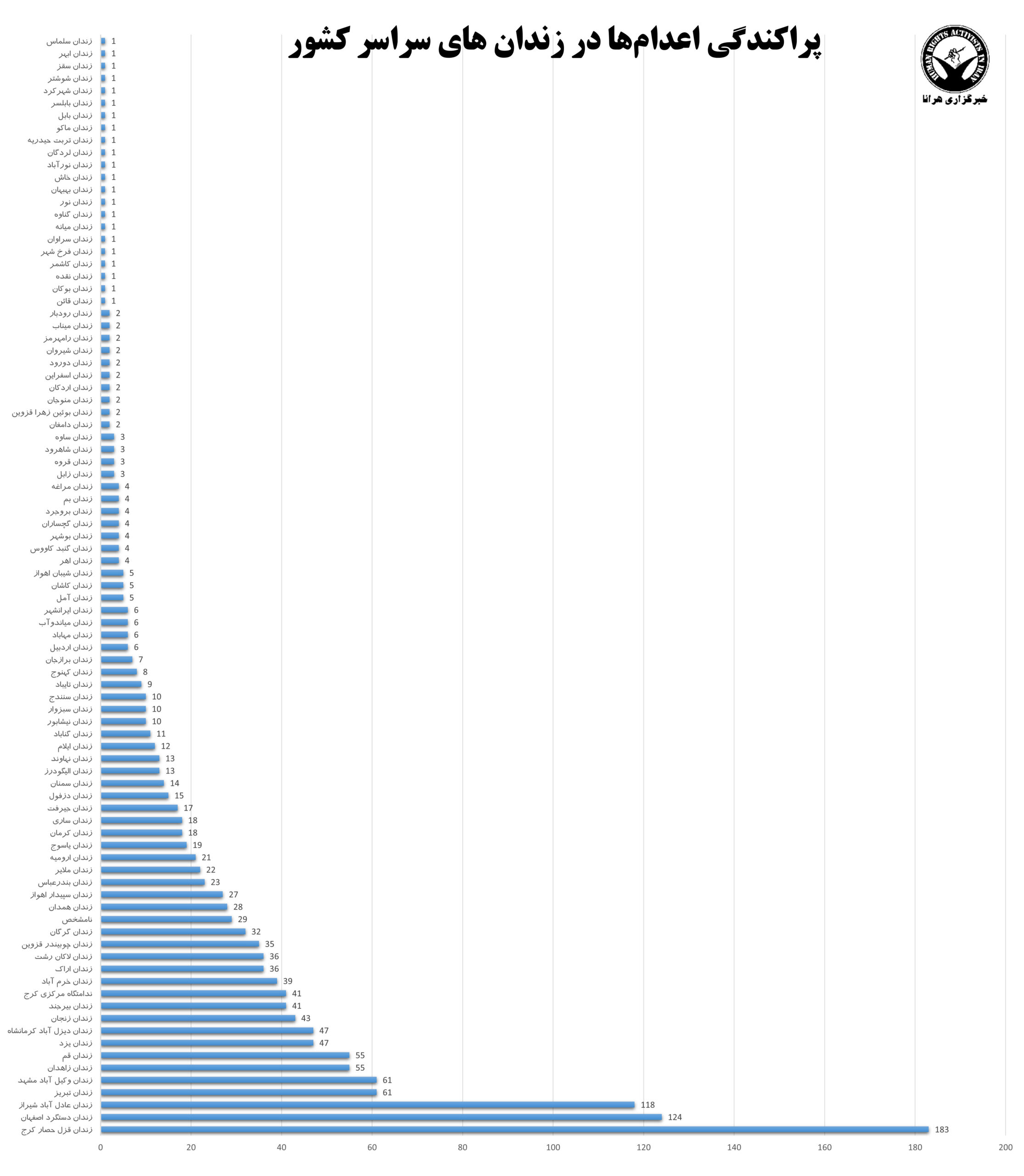 در نمودار زیر نیز اجرای حکم اعدام در زندان های مختلف کشور مورد بررسی قرار گرفته است. بر این اساس زندان قزلحصار کرج و دستگرد اصفهان در صدر اجرای احکام اعدام قرار دارند.