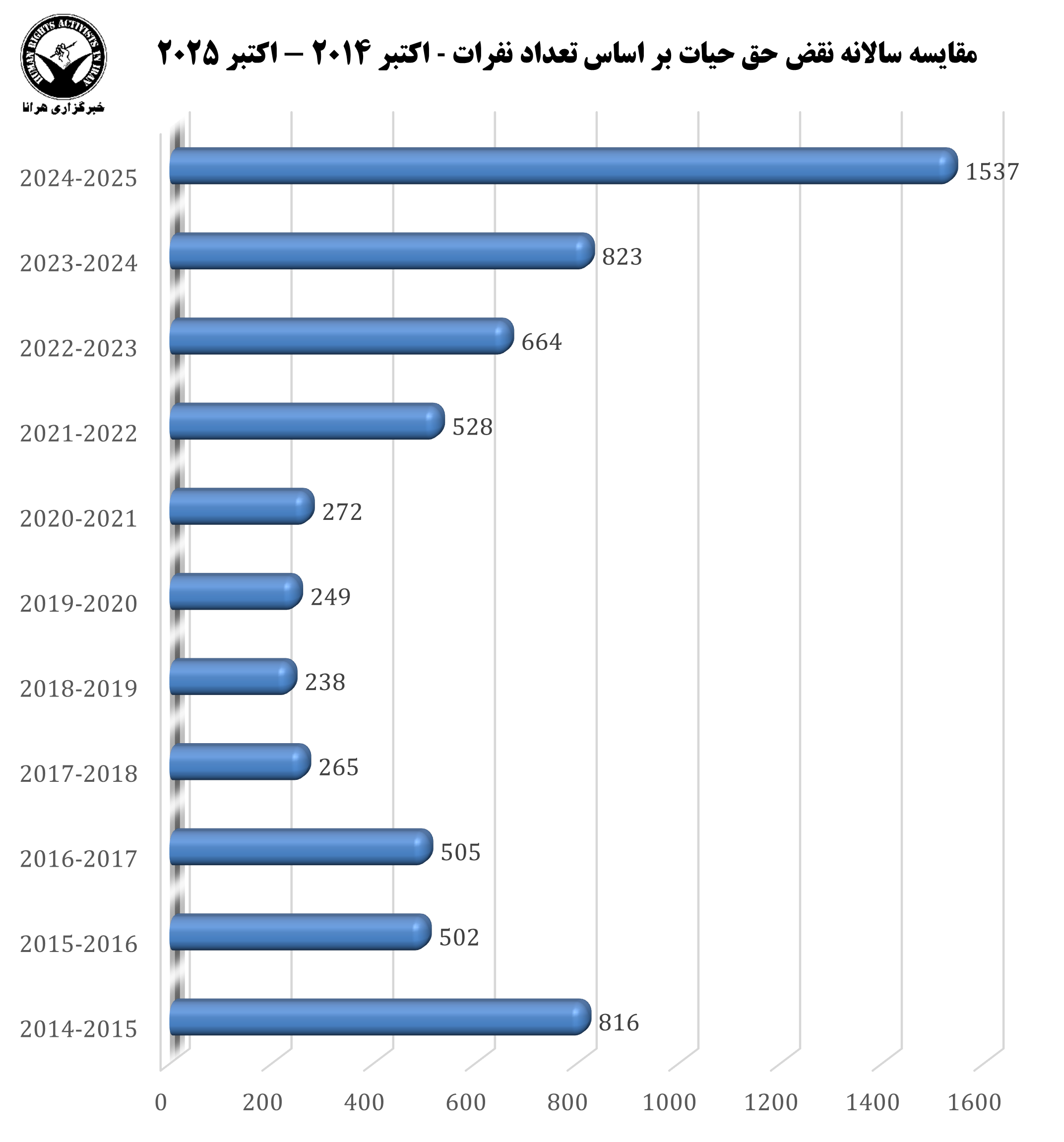 در مقایسه با سال گذشته (۸۲۳ مورد)، میزان اجرای احکام اعدام بیش از ۸۶٪ افزایش داشته و نسبت به میانگین سالانهی ده ساله نیز رشد چشمگیری را نشان میدهد. این آمار در حالی ثبت شده که دسترسی به اطلاعات رسمی و شفاف در این حوزه همچنان محدود بوده و بخش قابل توجهی از اعدام ها بهصورت مخفیانه یا بدون اطلاعرسانی عمومی انجام شده است.