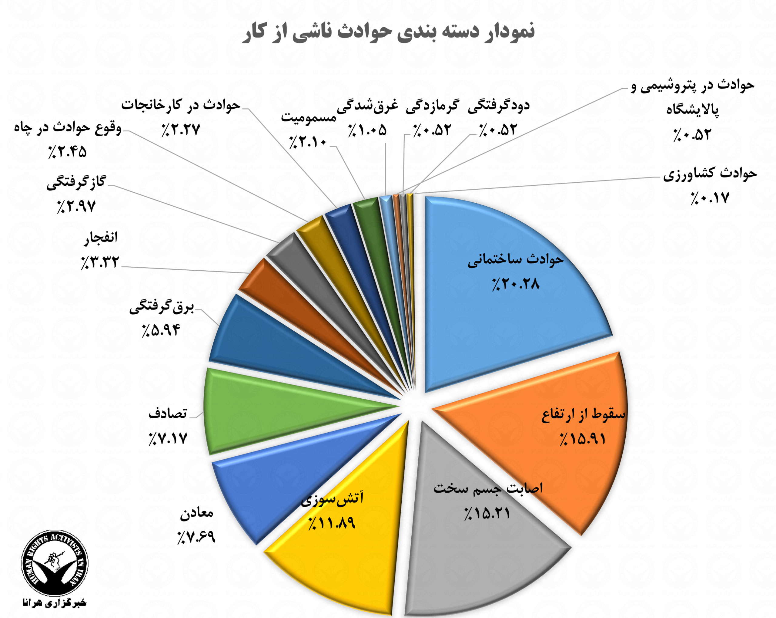بر اساس گزارشات گردآوری شده توسط بخش آمار این نهاد، %۲۰.۲۸ این حوادث مربوط به حوادث ساختمانی، %۱۵.۹۱ سقوط از ارتفاع، %۱۵.۲۱ اصابت جسم سخت، %۱۱.۸۹ آتش سوزی، %۷.۶۹ در معادن، %۷.۱۷ تصادفات، %۵.۹۴ برق گرفتگی، %۳.۳۲ انفجار، %۲.۹۷ گازگرفتگی، ۲.۴۵% وقوع حوادث در چاه، ۲.۲۷% در کارخانجات، ۲.۱۰% مسمومیت، ۱.۰۵% غرق شدگی، %۰.۵۲ گرمازدگی، ۰.۵۲% دودگرفتگی، %۰.۵۲ در پتروشیمی و پالایشگاه و ۰.۱۷% حوادث کشاورزی را شامل می شوند.