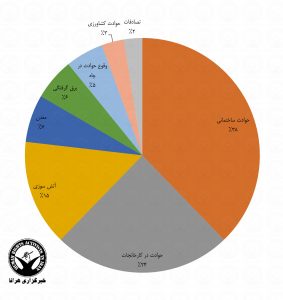 بر اساس گزارشات گردآوری شده توسط بخش آمار این نهاد، ۳۸% این حوادث مربوط به حادثه های ساختمانی، ۲۴% در کارخانجات، ۱۵% حوادث آتش سوزی، ۷% در معادن، ۶% برق گرفتگی، ۵% در چاه، ۳% حوادث کشاورزی و ۲% تصادفات را شامل می شوند.